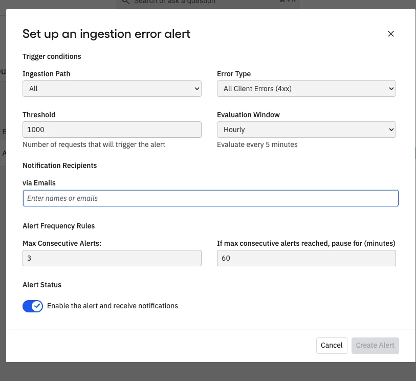 Ingestion Error Alerts notify customers when their data pipeline experiences spikes in client-side errors for SDK and API-based integrations. This helps detect and address data quality issues quickly before they lead to data loss or throttling.