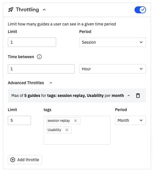 Worried you’re inundating users with content? Now you can specify the time that must pass before a new guide or survey appears. Additionally, teams can now implement tag-based throttles to restrict the number of guides or surveys with a specific tag shown within a given timeframe.