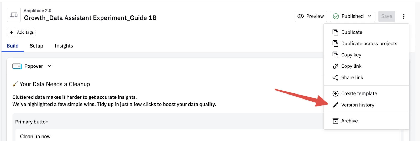 🔓 Access via the detail page of any guide or survey > Options menu > Version history.