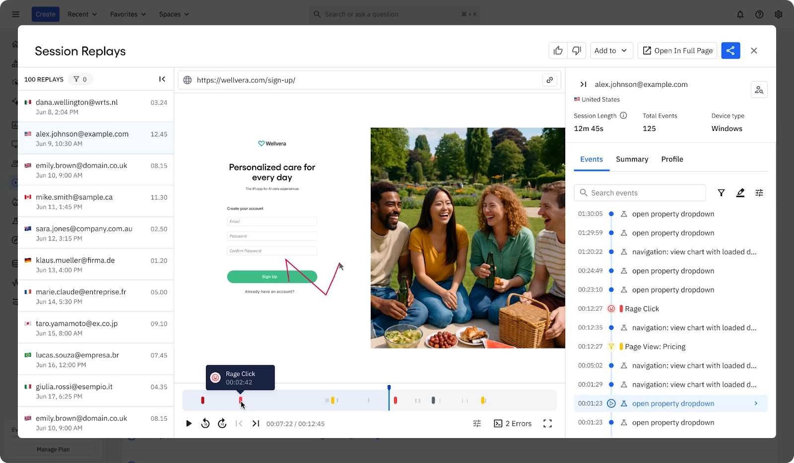 Starting with rage clicks and dead clicks, Session Replay now highlights sessions where users exhibit clear signs of confusion or annoyance so you can fasttrack critical UX improvements.