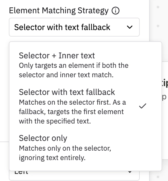 We’re introducing three new targeting strategies for more precise pin/tooltip positioning, including: "Selector + Inner text" (new default), "Selector with text fallback", and "Selector only."