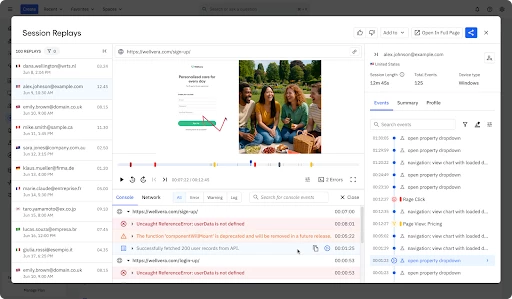 Error analytics eliminates the guesswork by tracking technical issues within the context of real user sessions. With our latest feature, you'll see JavaScript console logs, warnings, and errors all displayed directly in the Session Replay timeline.